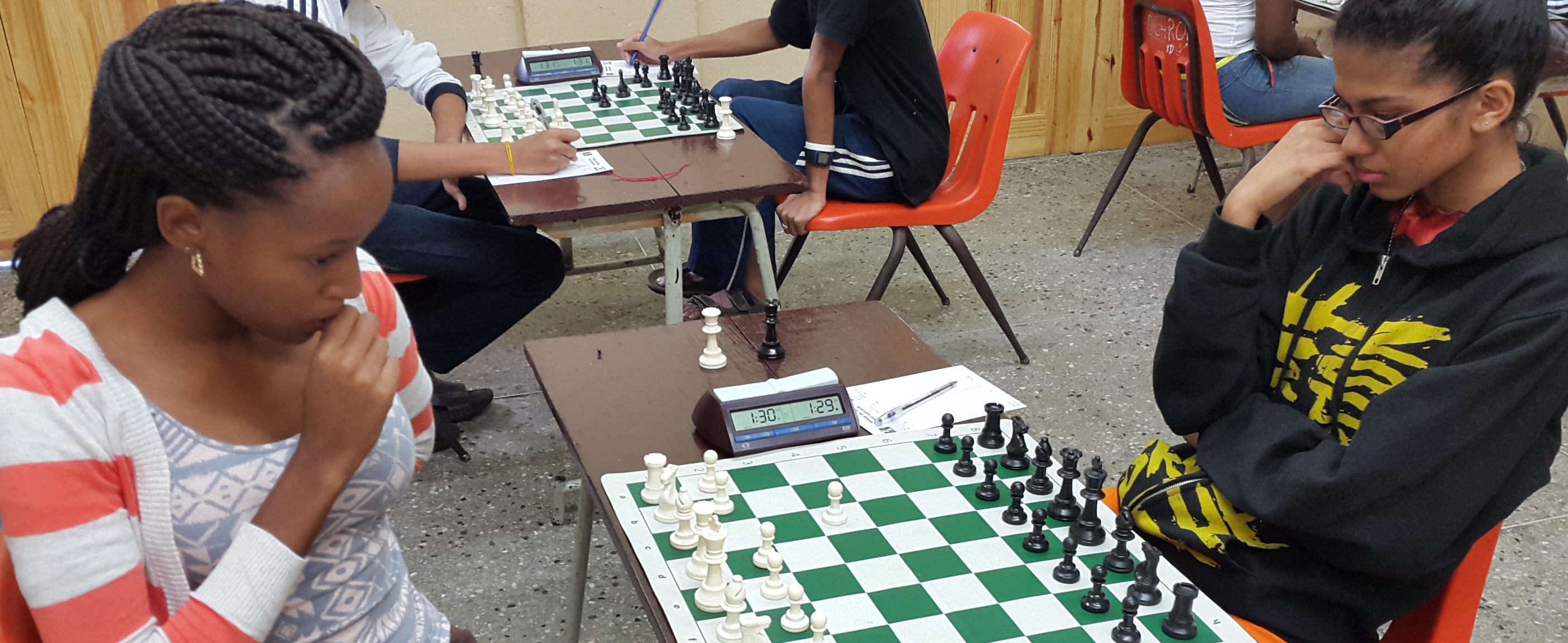 Najarah (left) played her usual English Opening (first move pawn to c4) against Javanna (right). The game was tense and went for well over 2 hours but in the end Najarah who got significant activity on the queenside, was able to secure her first ever win against the young Miss Smith. Meanwhile the other match up saw Nikeilia Chuniesingh taking a full point from Sadiqah Razark. The 4 girls, who will play each other twice in this tournament, give a good lesson to citizens of T&T in that they fight each other fiercely on the chess board but remain friends afterwards.
